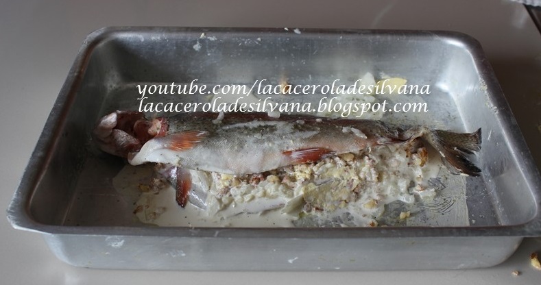 Rellenar la trucha con 2 dientes de ajo picados y la mitad de la cebolla