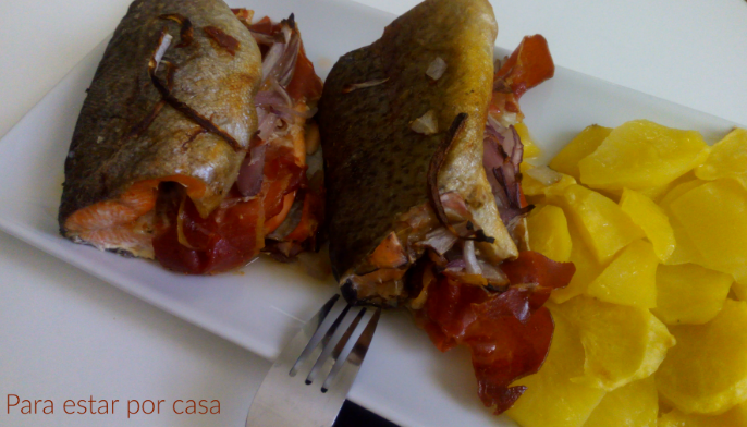 La conocida receta de las truchas con jamón, en este caso, preparada en el horno y acompañada de una buena base de patatas.