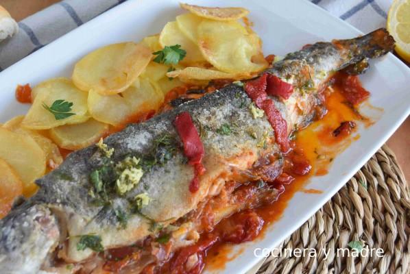 Servimos la trucha con jamón o trucha a la Navarra con el tomate y pimientos y acompañamos con las patatas; y listas para comer.