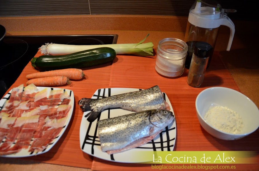 Lo primero que vamos a hacer es cortar toda la verdura en bastones finos. Y también vamos a cortar las truchas en dos para poder cocinarlas mejor.