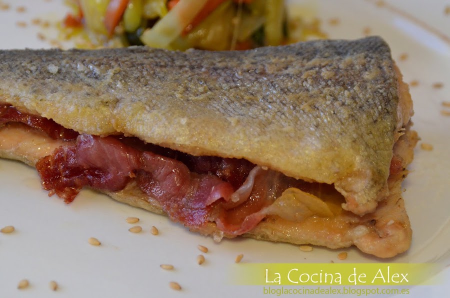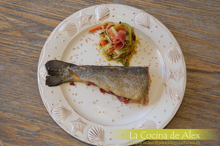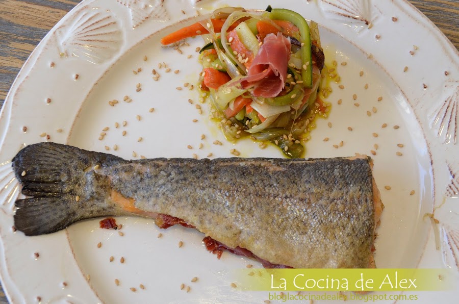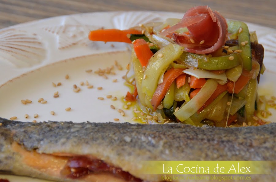 Para la presentación final acompañamos las truchas con las verduras al "wok" y adornamos con una loncha de jamón y unas semillas de sésamo.