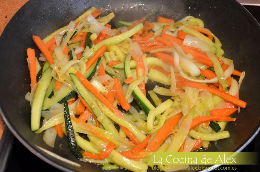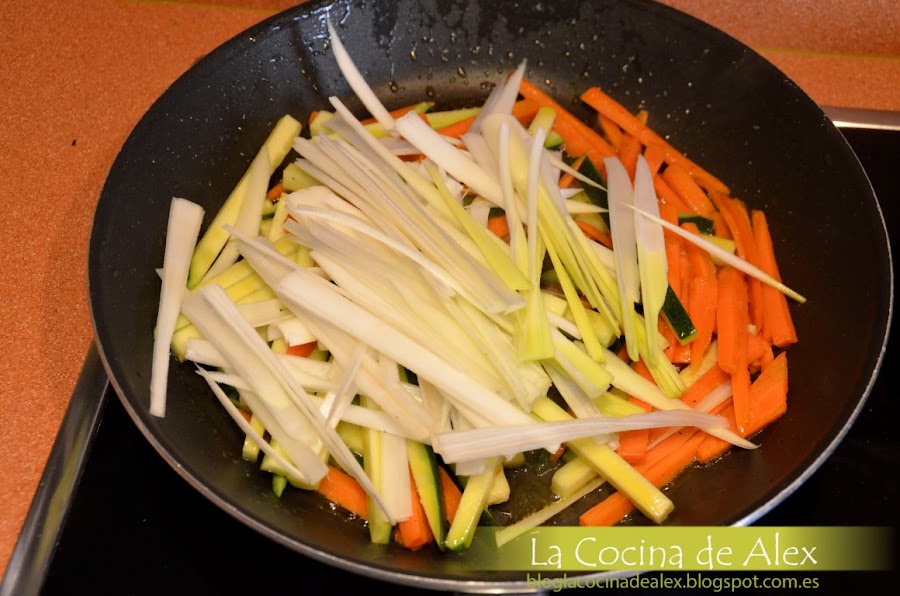 Empezamos a freír las verduras en una sartén con un poco de aceite de oliva, iremos de las verduras mas duras a las mas blandas, es decir, primero la zanahoria, cuando este un poco pochada pondremos el calabacín y por ultimo el puerro. Cocinando todo junto durante 5-6 minutos mas.