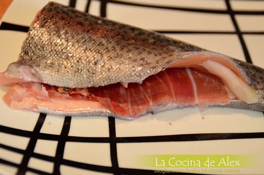 Rellenamos el interior de las truchas con el jamón serrano y las enharinamos. Reservamos.