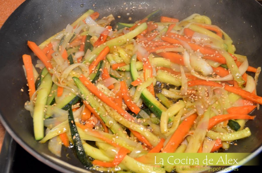 Para terminar las verduras solo nos queda añadir un chorrito de salsa de soja, un poco sésamo y cocinar 1 minuto para que se junten todos los sabores.