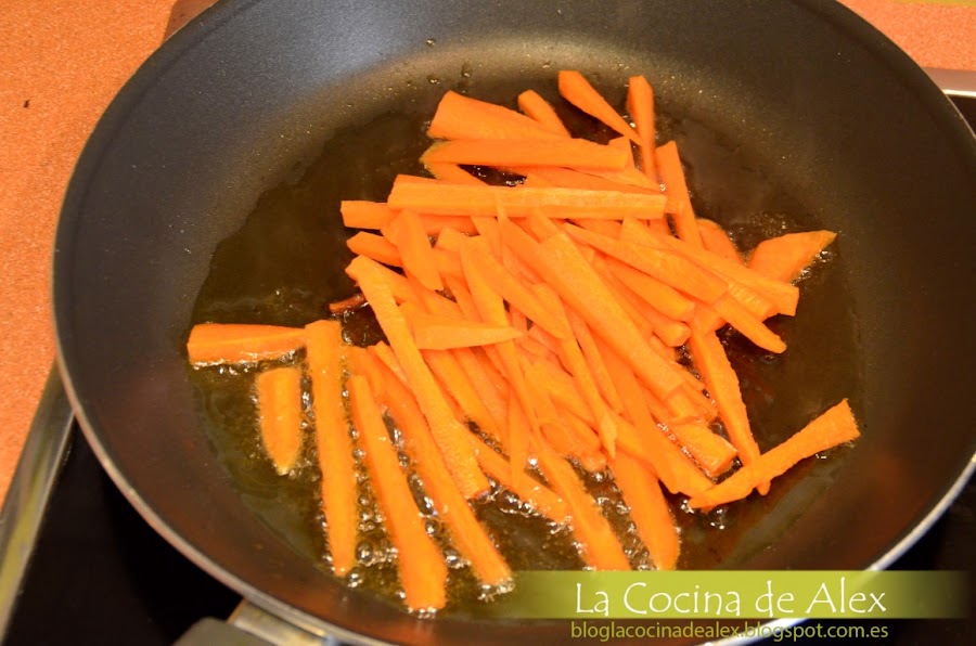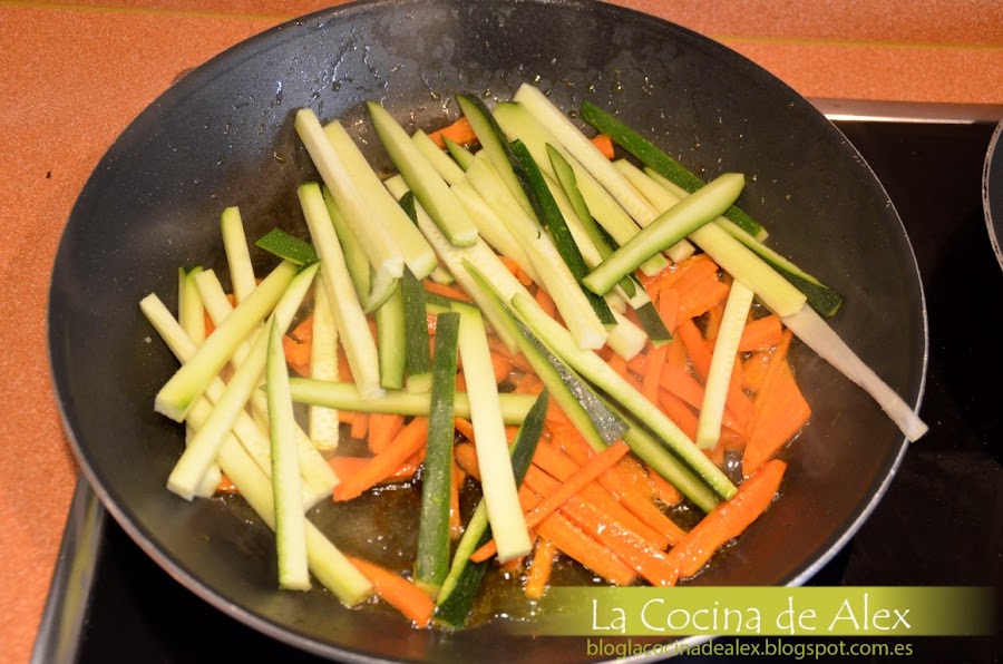 Empezamos a freír las verduras en una sartén con un poco de aceite de oliva, iremos de las verduras mas duras a las mas blandas, es decir, primero la zanahoria, cuando este un poco pochada pondremos el calabacín y por ultimo el puerro. Cocinando todo junto durante 5-6 minutos mas.