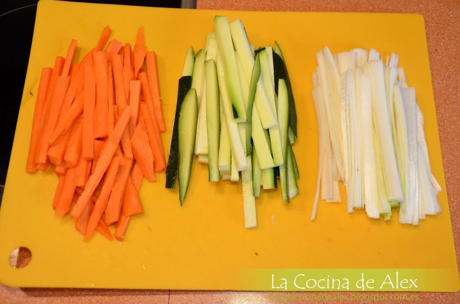 Lo primero que vamos a hacer es cortar toda la verdura en bastones finos. Y también vamos a cortar las truchas en dos para poder cocinarlas mejor.