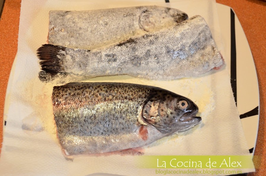 Rellenamos el interior de las truchas con el jamón serrano y las enharinamos. Reservamos.
