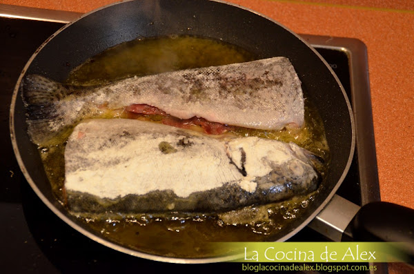 Rellenamos el interior de las truchas con el jamón serrano y las enharinamos. Reservamos.