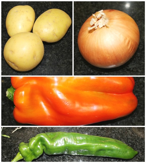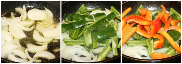 En una sartén ponemos un poco de aceite (el suficiente para cubrir la base), ponemos la cebolla cortada en juliana, el pimiento verde y el pimiento rojo cortados a tiras, lo pocharemos todo junto (hasta que veamos que la cebolla transparenta), retiramos del fuego y reservamos.