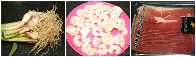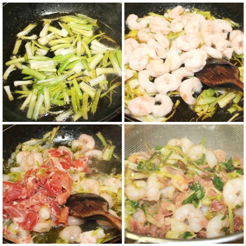 Cuando esté tostado incorporamos las gambas y el jamón serrano partido en trocitos pequeños. Y lo tendremos unos 5 minutos más.