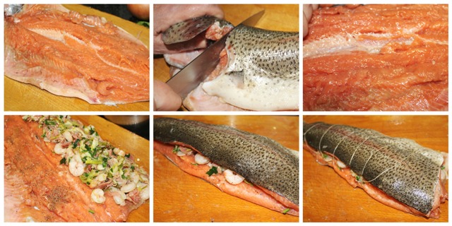 Volvemos a la trucha, la salpimentamos al gusto, y en uno de los lomos ponemos el relleno. La cerramos y le pasamos un hilo de cocina para sellarla y que no se nos escape el relleno durante la cocción, reservamos.