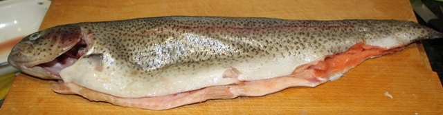 Vamos con la trucha. La abrimos por la mitad, y le quitamos la cabeza y las espinas.