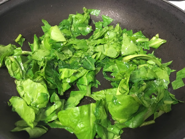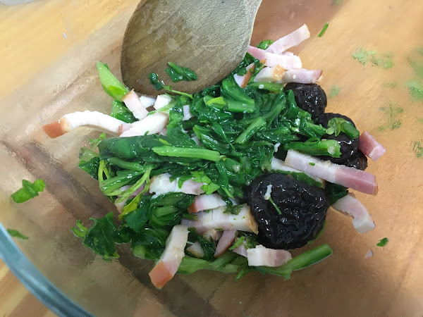 Picamos las hojas de acelga y las pasamos 1 minuto, no más, por una sartén con aceite. Una vez pasadas por la sartén las retiramos, las ponemos en un bol y le añadimos el perejil picado, el bacon y las ciruelas pasas y lo mezclamos.