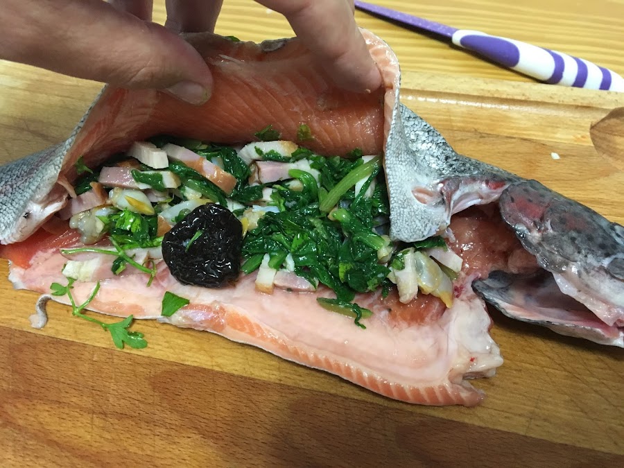 Con toda esa mezcla rellenamos la trucha y la cerramos con unos palillos de dientes.