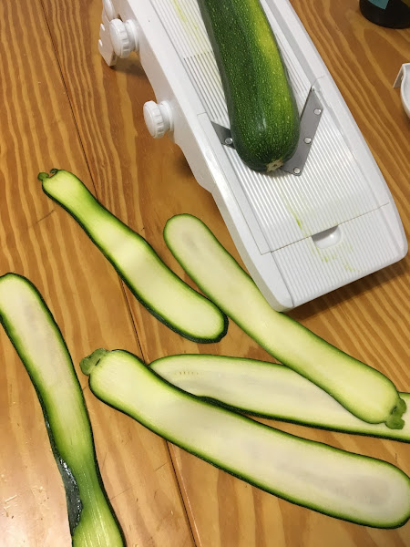 Con una mandolina sacamos unas lonchas de calabacín. Las ponemos con un poco de aceite y salpimentados en una plancha. Los tenemos 1 minutos por cada lado y retiramos.
