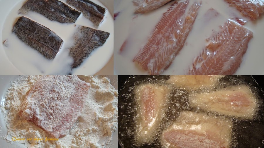 Escurrir, secar muy bien y condimentar con sal y pimienta negra. Pasar por harina de trigo y sacudir lo que sobre.