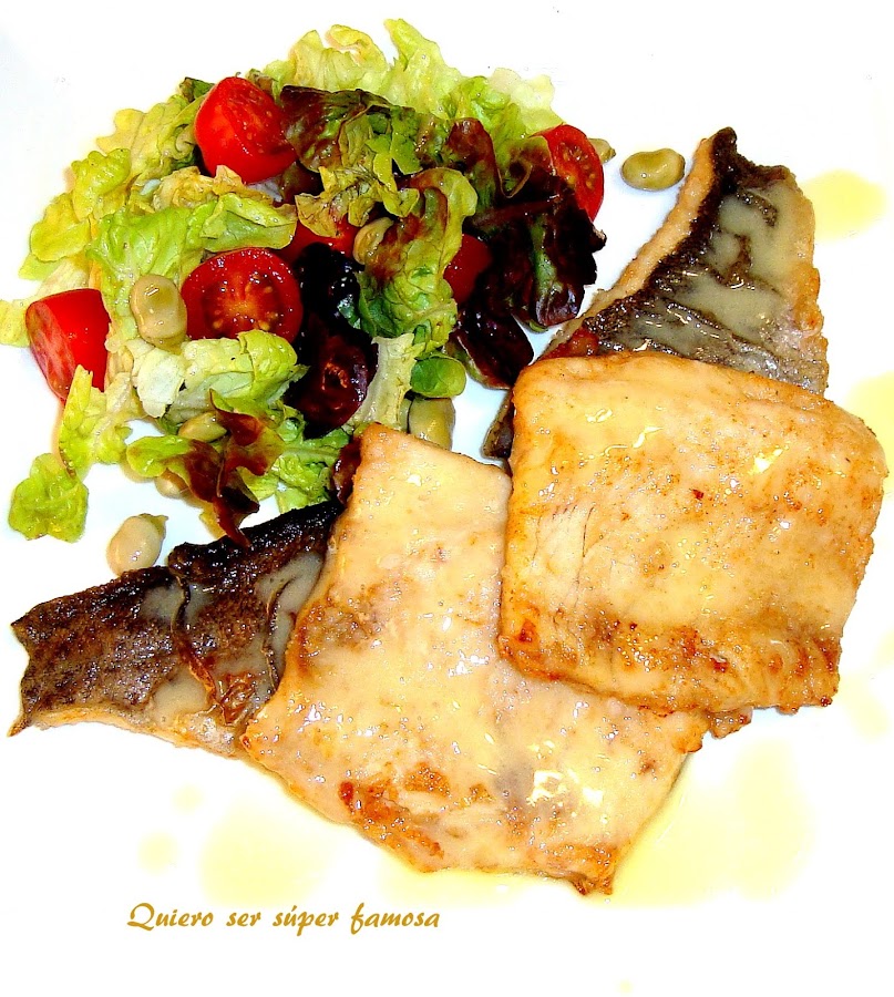Lo he acompañado de una ensalada verde con tomate sherry y habas tiernas en aceite.