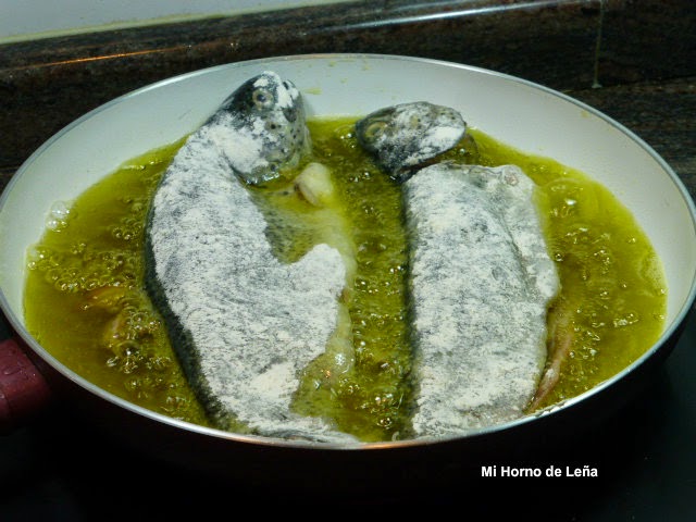 Ponemos harina en un plato y pasamos las truchas para que se pegue harina por los dos lados.