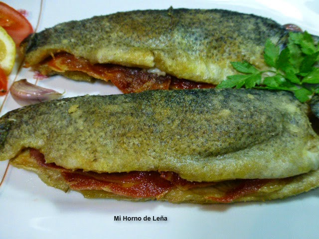 Ya limpias las abrimos y ponemos dentro dos lonchas de jamón, las cerramos y salamos un poco por los dos lados de la piel.