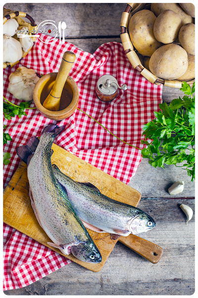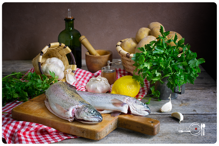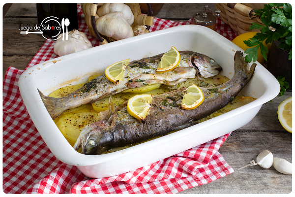 Lavar y secar bien las truchas. Salpimentar y colocar sobre las patatas.