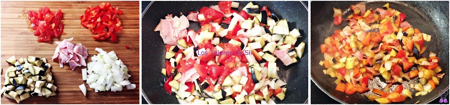 En una sartén, añade 3 cucharadas de aceite y rehoga las verduras junto con el bacon.