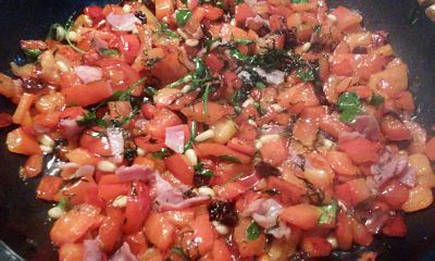 Añade el bacón partido en tiras o trocitos, o los tacos, remueve y añade las pasas hidratadas y los piñones.