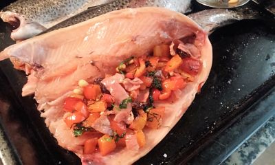 Abre las truchas por la mitad, retira la espina central ( puedes pedirlo al pescadero y te ahorras un buen trabajo ). Rellena cada trucha con el sofrito anterior.