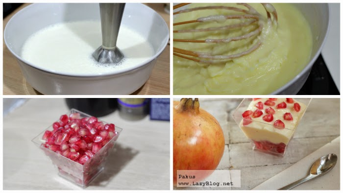 En un bol añadimos a la crema una tarrina de queso tipo Philadelphia y aprovechando que la crema está caliente, dejamos que se funda dentro. Ahora montamos el postre poniendo abajo unos granitos de granada mollar de Elche, cubrimos con la crema de queso y decoramos con más granitos de granada. Fácil, fácil y rico, rico. Espero que os guste y os animéis a prepararlo.