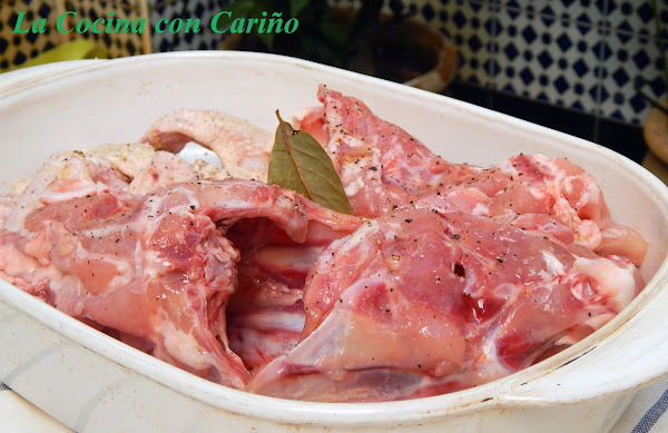 Ponemos el horno a 180 ºC. por arriba y por abajo sin ventilador. Mientras vamos poniendo en una tartera apta para el horno, las alias y los caparazones. Salpimentamos y vertemos por encima la leche en polvo. Añadimos el vino y el agua, un chorrito de aceite de oliva virgen extra y el laurel. Metemos a hornear, unos 25 minutos, hasta que se dore. Cuando ocurre esto damos la vuelta a las piezas de ave y lo mismo.