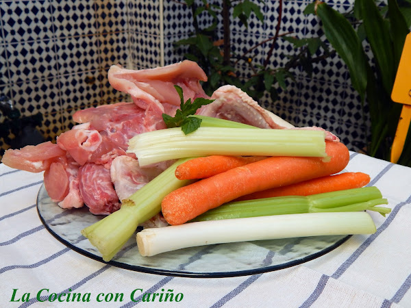 Una vez listo, sacamos la carcasa y las alitas y ponemos en una olla con las verduras y 3 litros de agua. Con un poquito de agua recogemos los restos del fondo de la tartera y vertemos en la olla. Ponemos a hervir. Espumamos y dejamos hasta que se consuman 2/3 del líquido. Nos quedaremos con 1 litro finalmente.
