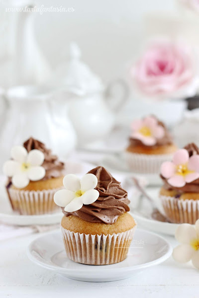 Para hacer estos cupcakes he usado la receta del bizcocho especial para cupcakes, le receta está en blog, en esta ocasión he añadido a la masa unos arándanos, últimamente pongo arándanos en todo lo que hago... me encantan, de ahí las manchas oscuras que podéis ver en la fotos, algunos de ellos se derramaron por la paredes durante el horneado, aportan al bizcocho mucha jugosidad y sabor extra... riquísimos...