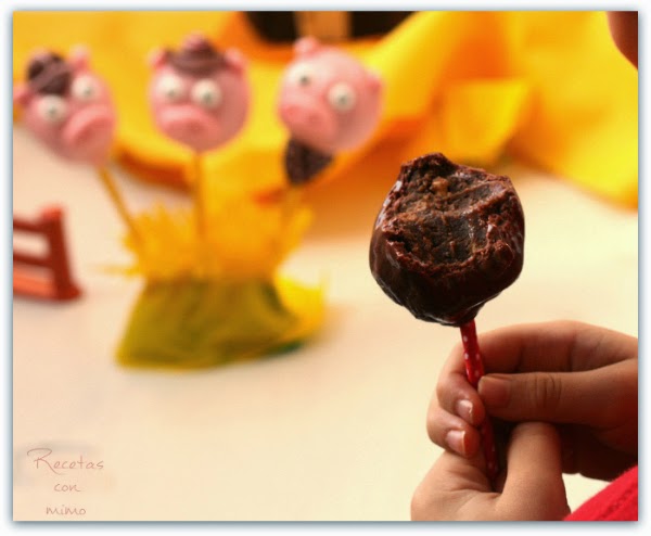 6 - Cogemos el fondant y lo amasamos con las manos un rato para ablandarlo. Con ayuda de un rodillo lo aplanamos y con un vaso o cortapastas cortamos un círculo grande y recubrimos con él el cake pop, con cuidado de alisar toda la superficie. Cortamos la nariz y las orejas del cerdito-lobo y las pegamos humedeciendo las superficies con un gota de agua. Los ojos son de azúcar. A partir de aquí ya se puede usar la imaginación para moldear lo que se nos ocurra como complemento.Y no dejeis de ir a ver el resto de propuestas para esta mesa de fiesta de los tres cerditos, podeis descubrirlas AQUI