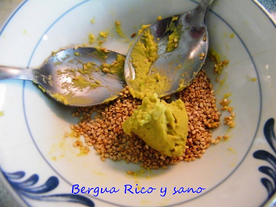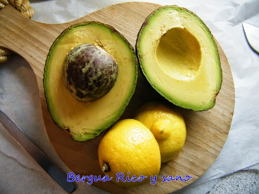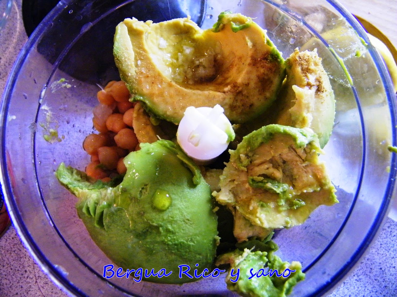 1. Trituramos la pulpa del aguacate, los garbanzos cocidos y escurridos, 2 cucharadas de aceite, las especias y el zumo de 1/2 limón.