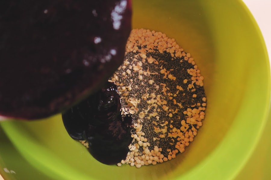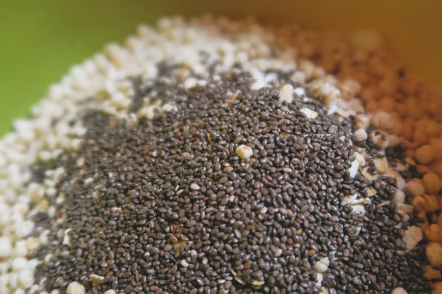 En un bowl, añadir la avena molida o harina de avena con las 3 cucharaditas de chía. En la imagen pueden ver quinoa inflada, que venía en mi caja de avena, pero no es el ingrediente principal de esta receta, por lo tanto si no tienen quinoa, no se preocupen, de todos modos queda bastante bien.