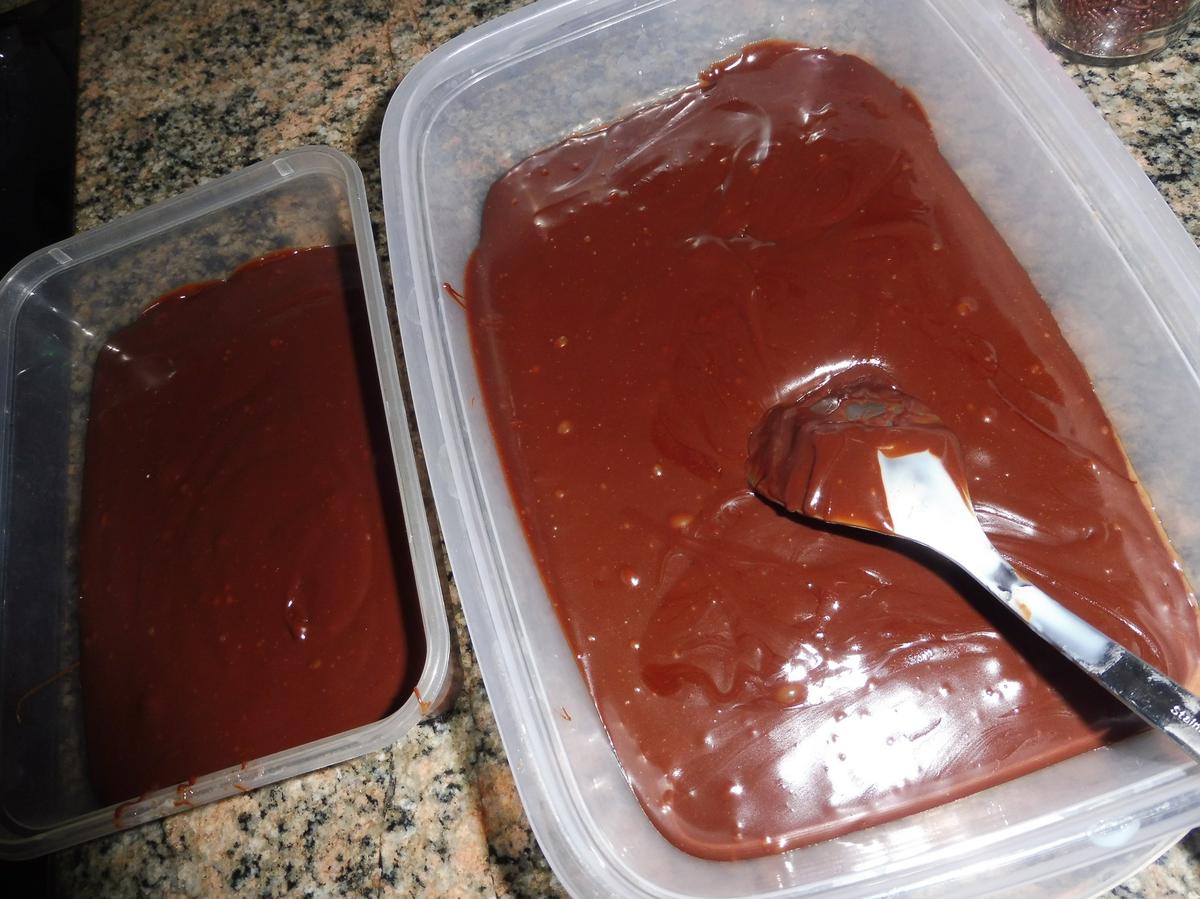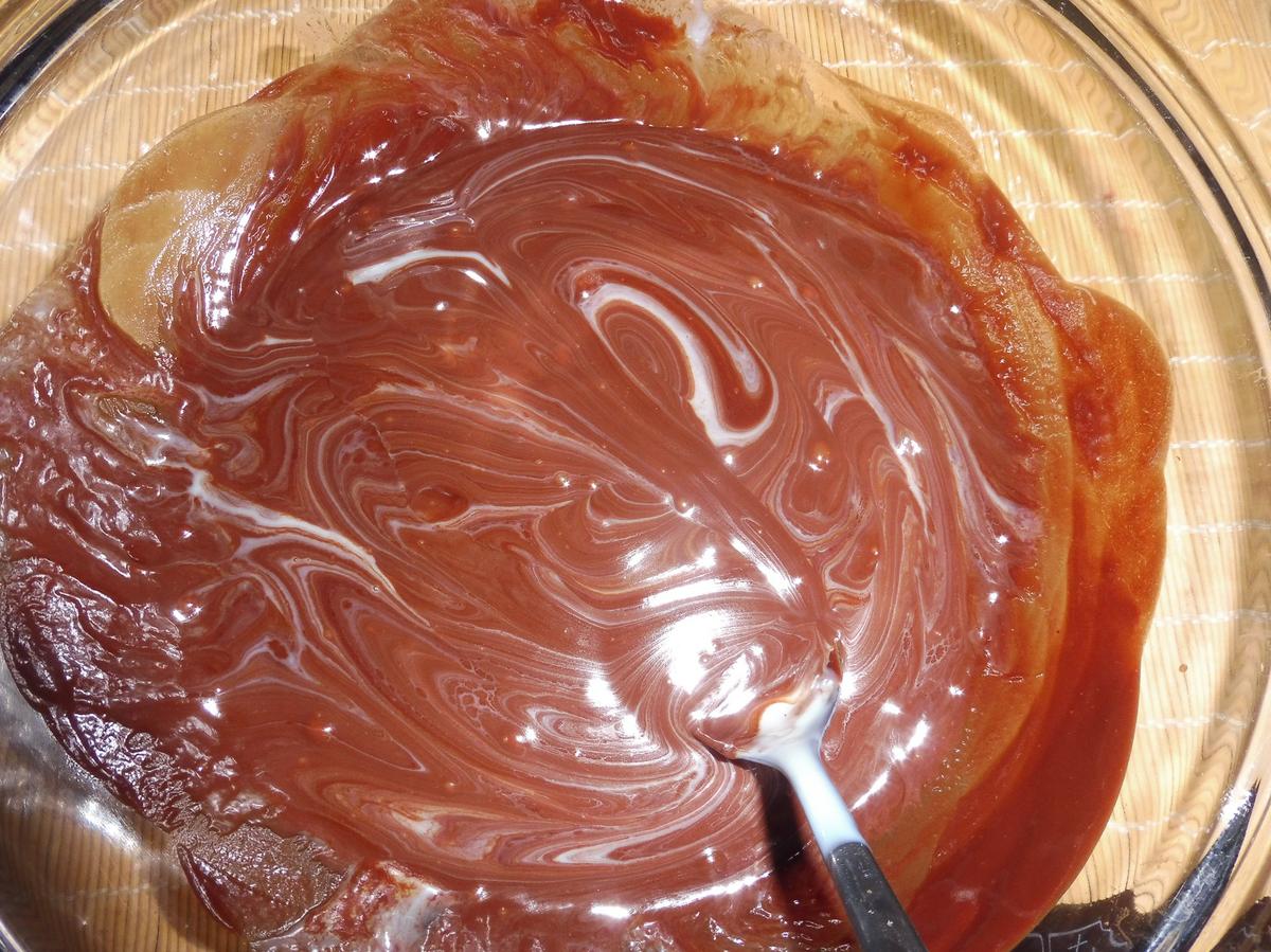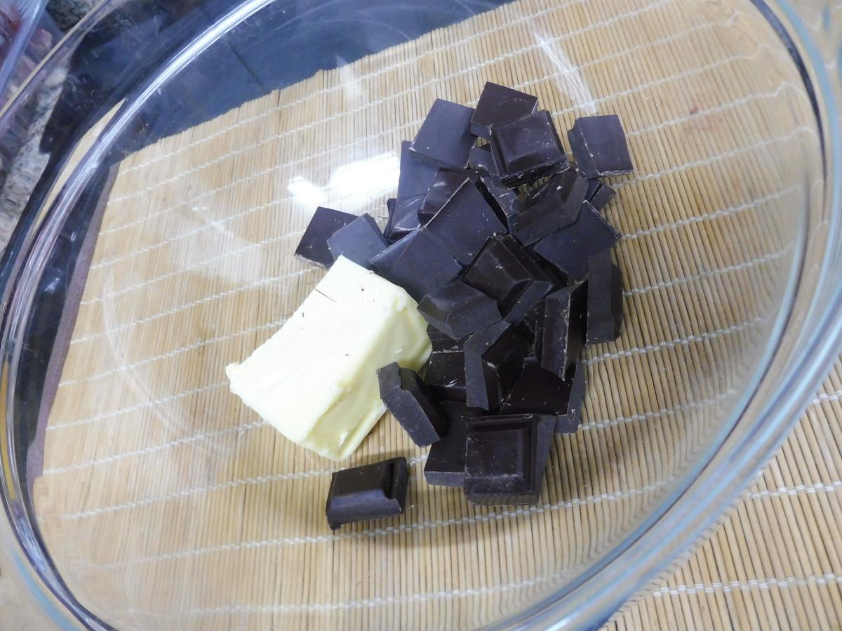 Tan solo hay que derretir la mantequilla con el chocolate, bien al baño María (recomendado) o en el microondas. Si optáis por ésto último, hacerlo a toques de 20 segundos a máxima potencia, remover y volver a meter, así sucesivamente hasta derretir. De ésta forma no perderemos el brillo del chocolate.