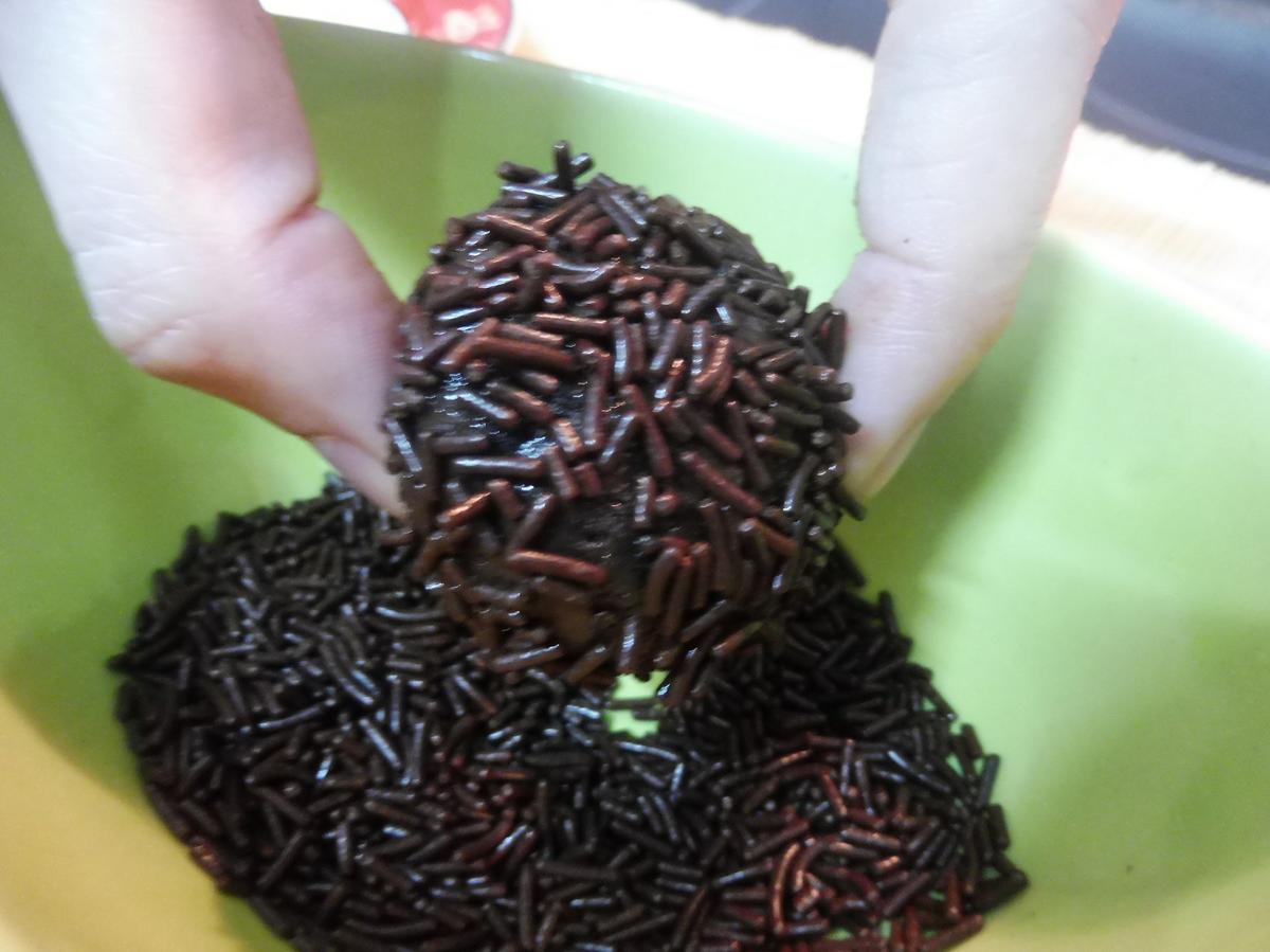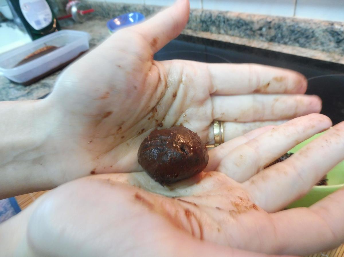 Una vez solidificada, haremos bolitas a poder ser todas del mismo tamaño. Con el propio calor de las manos derretirá un poco la parte exterior y eso nos facilitará que el topping se adhiera, en éste caso los fideos de chocolate, solo hay que “rebozar” las bolitas.