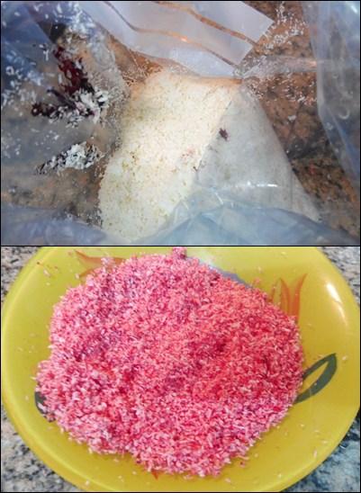 Para la cobertura, introduciremos el coco, el agua y el colorante en la bolsa de plástico. Agitaremos hasta que todo el coco quede con la misma tonalidad.