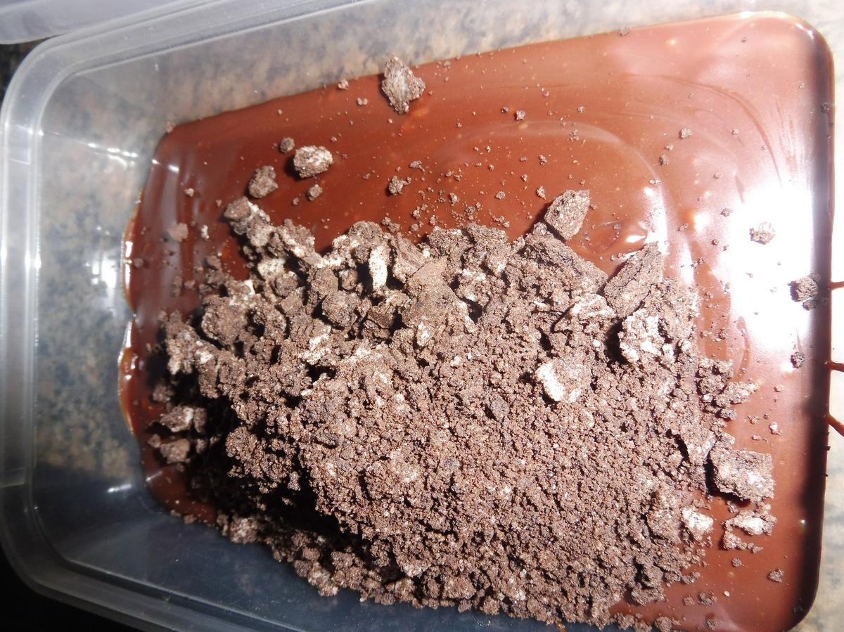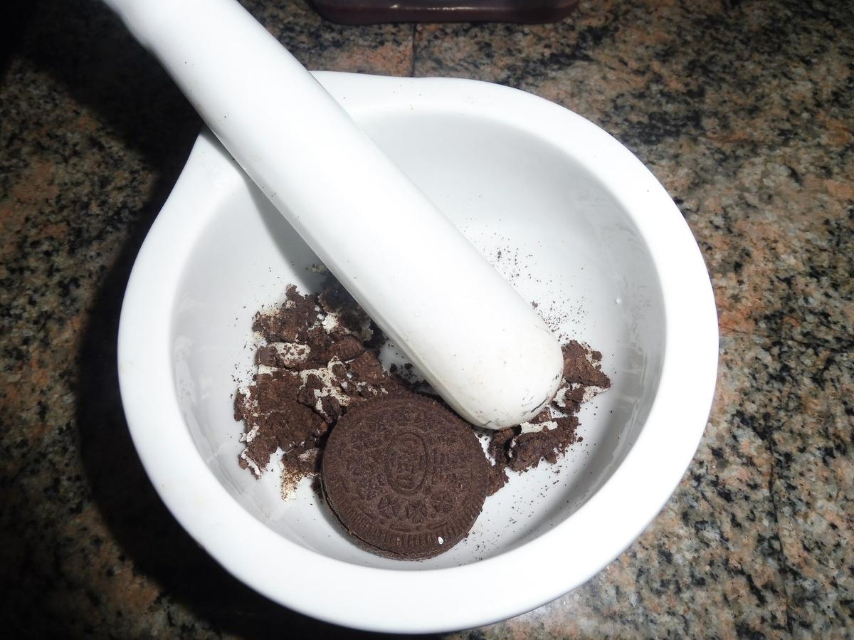 Fideos chocolate En una picadora o en un mortero, picaremos las galletas tipo Oreo. Una vez bien picaditas lo añadiremos a la masa de la trufa ( el cuarto de la masa retirado). Tapar y refrigerar al menos 4/6 horas.