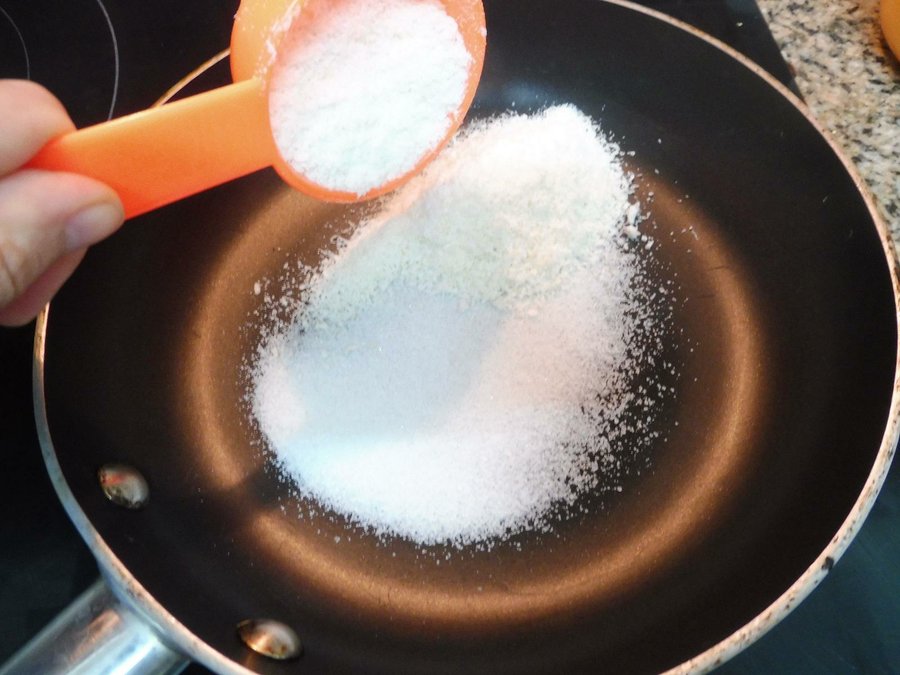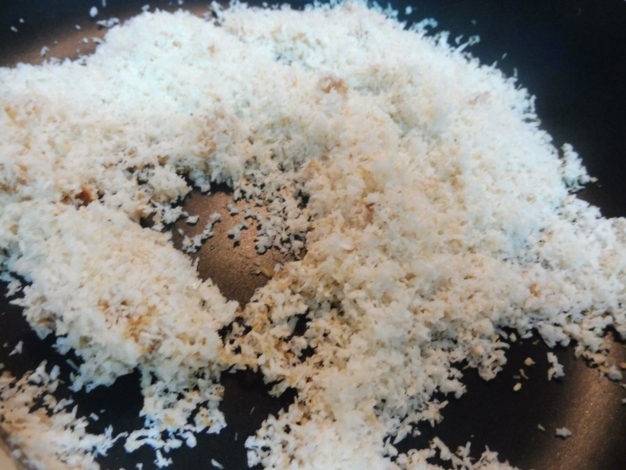 Azúcar (1 cucharadas aprox) En una sartén añadiremos el azúcar y el coco. Sin dejar de mover iremos tostando el coco y caramelizando hasta que adquiera un tono dorado. Reservar.