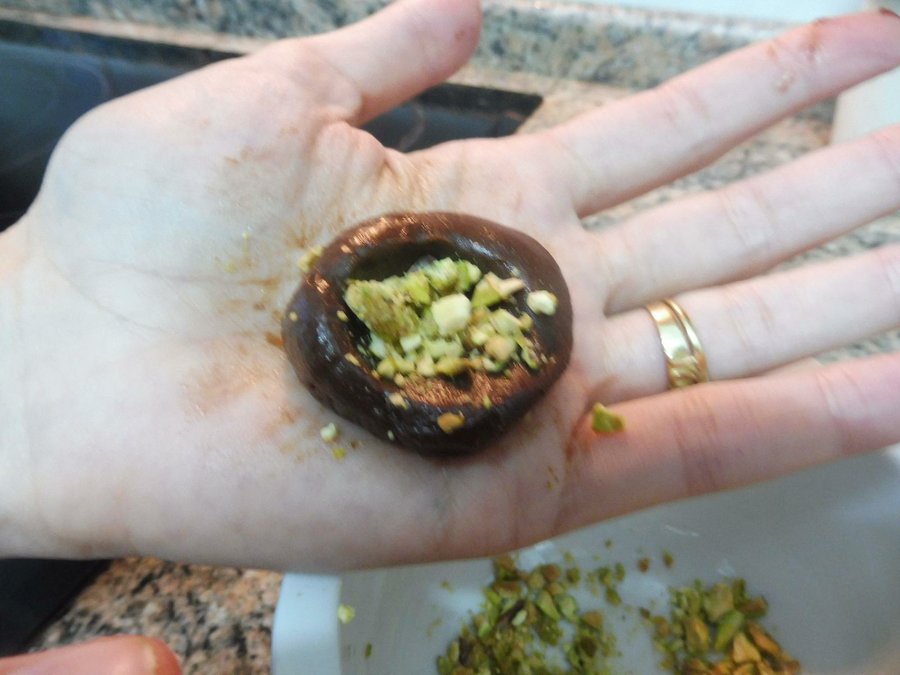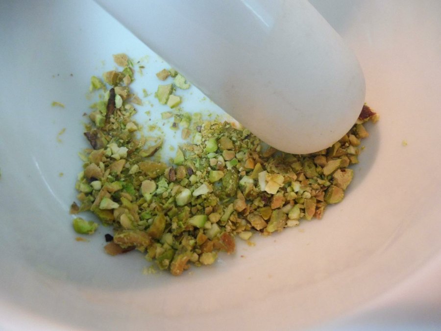 Lo siguiente será picar los pistachos en un mortero o picadora y rellenaremos el centro de las bolitas. La manera más sencilla es elaborar las bolas y después con un dedo hacer una hendidura en el centro. Rellenar con los pistachos y cerrar con la misma masa. Repetiremos el proceso con el resto.