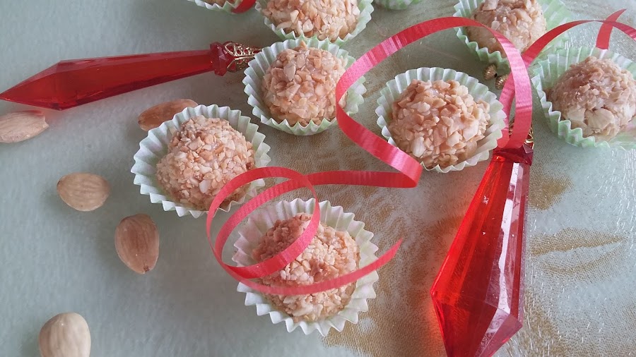 4- Sacar la masa y hacer las bolitas de tamaño que les gusta. Rebosar con las almendras picadas.