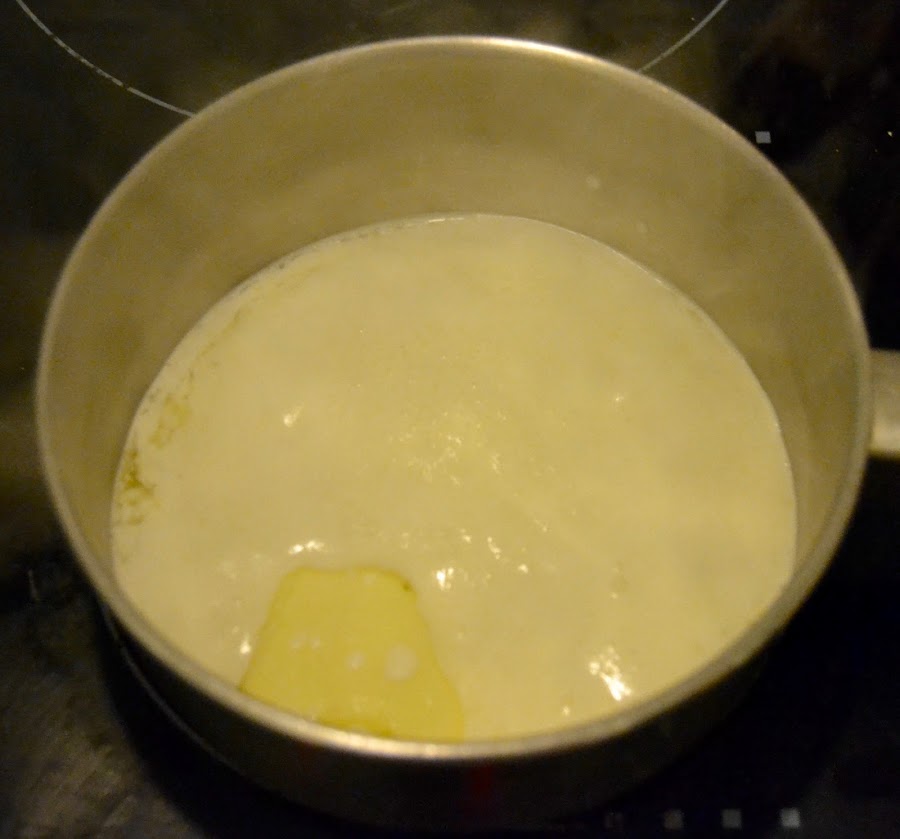 Lo primero que hay que hacer, es poner la nata (crema de leche) junto con la manteca en una cacerola a fuego medio. Cuando empieza a hervir la retiramos del fuego.