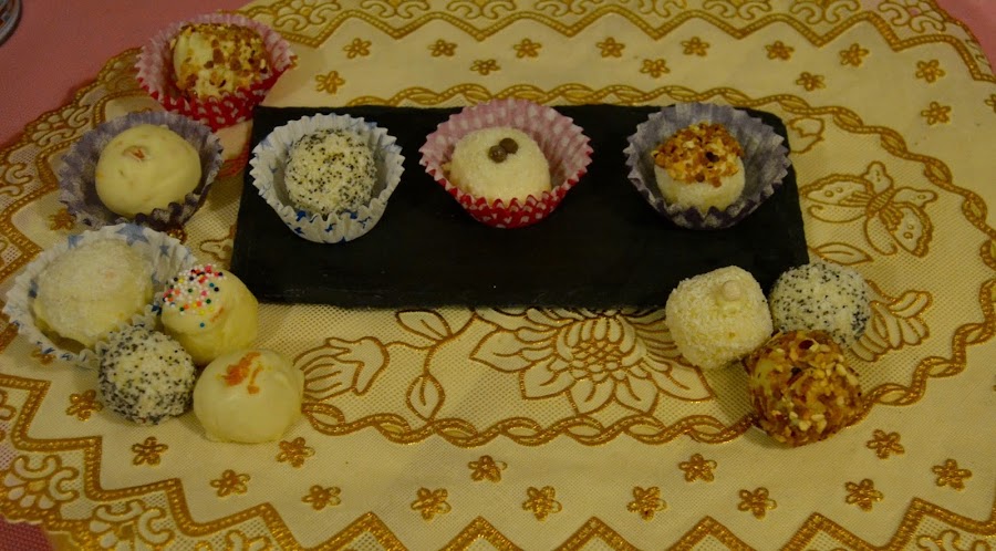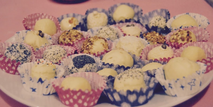 Hoy traigo una delicia de chocolate blanco. Muy faciles de hacer, y que van a encantar! Trufas de chocolate blanco con cobertura de sabores.