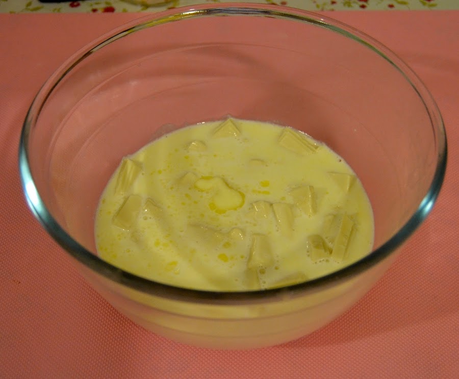 Ahora, en un bowl troceamos el chocolate blanco, y le agregamos la preparación anterior, y la dejamos un rato sin revolver hasta que se ablande el chocolate.