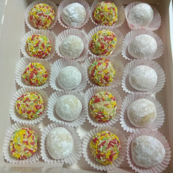 Pasado el tiempo con ayuda de una cucharilla de café sacamos porciones y las boleamos con las manos. Entonces las rebozamos con lo que hayamos elegido.Yo en este caso elegí unos fideos de colores y otras con azúcar glas.