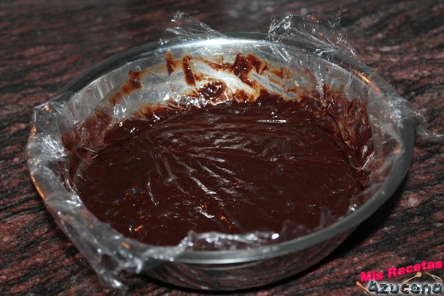Seguiremos añadiendo el brandy en el cual habremos puesto el café, volvemos a mezclar bien, ahora cogeremos film transparente y cubriremos el chocolate, justo encima de la mezcla para que no cree corteza, metemos en la nevera y dejaremos hasta que endurezca y se pueda trabajar, será un mínimo de tres horas.