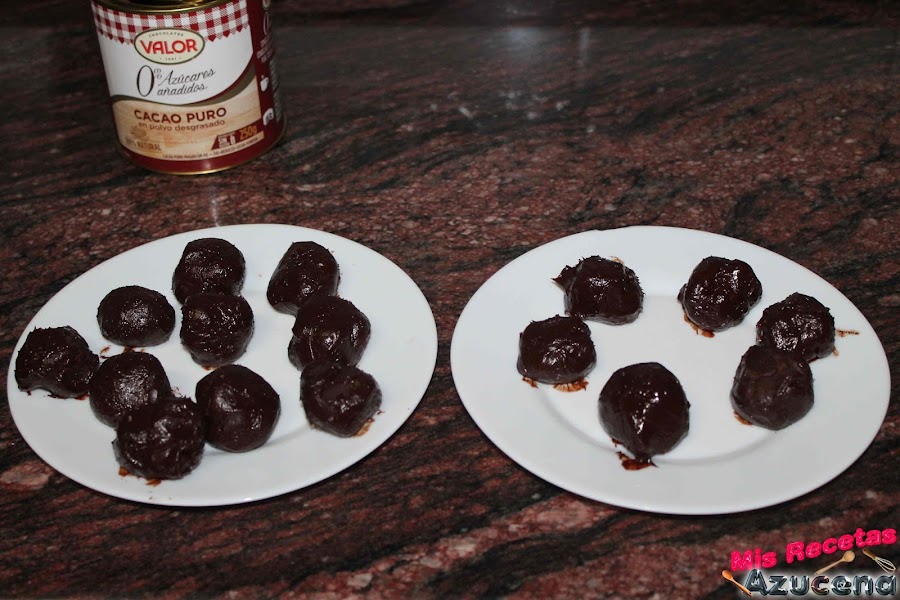 Una vez fría la sacamos de la nevera, nos preparamos un plato donde pondremos el cacao en polvo, ahora con ayuda de una cuchara cogemos una cantidad no muy grande y con ayuda de nuestras manos le iremos dando un poco de forma, no os preocupéis porque en un principio no queden muy redondas, ahora toca rebozarlas en el cacao, en este paso es cuando les daremos bien la forma rebozándolas un par de veces para que nos permita dejarlas bien redondas, estos pasos los repetiremos hasta terminar con todo el chocolate.