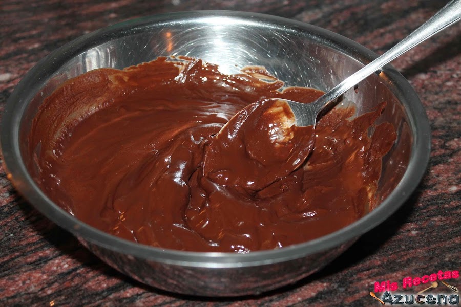 Calentamos la nata (crema de leche) en el microondas hasta que esté bien caliente, la sacamos y la añadimos al cuenco del chocolate, removemos hasta que se forme una crema y todo el chocolate este bien fundido.