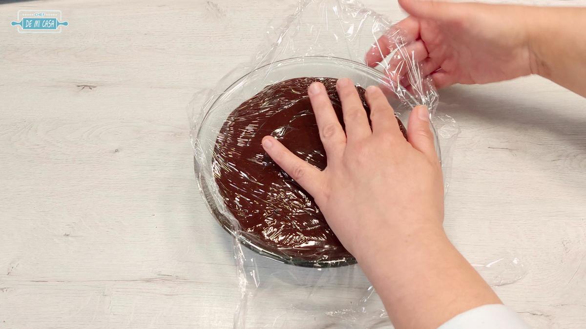 Después lo vamos a colocar en un recipiente que engrasaremos previamente con un poquito de aceite o de mantequilla. Para que no se endurezca por encima, lo tapamos a piel con film transparente.