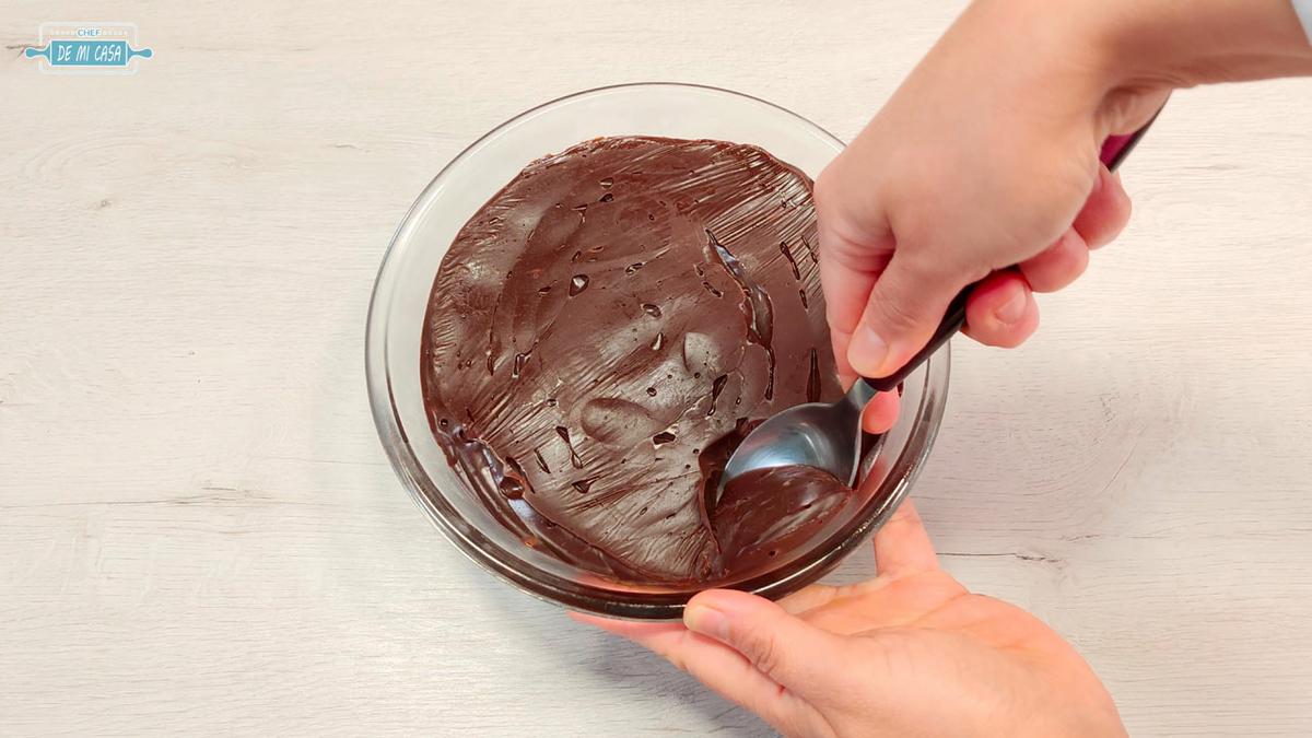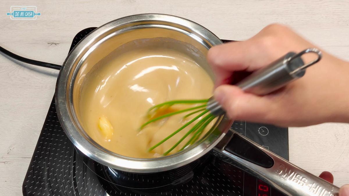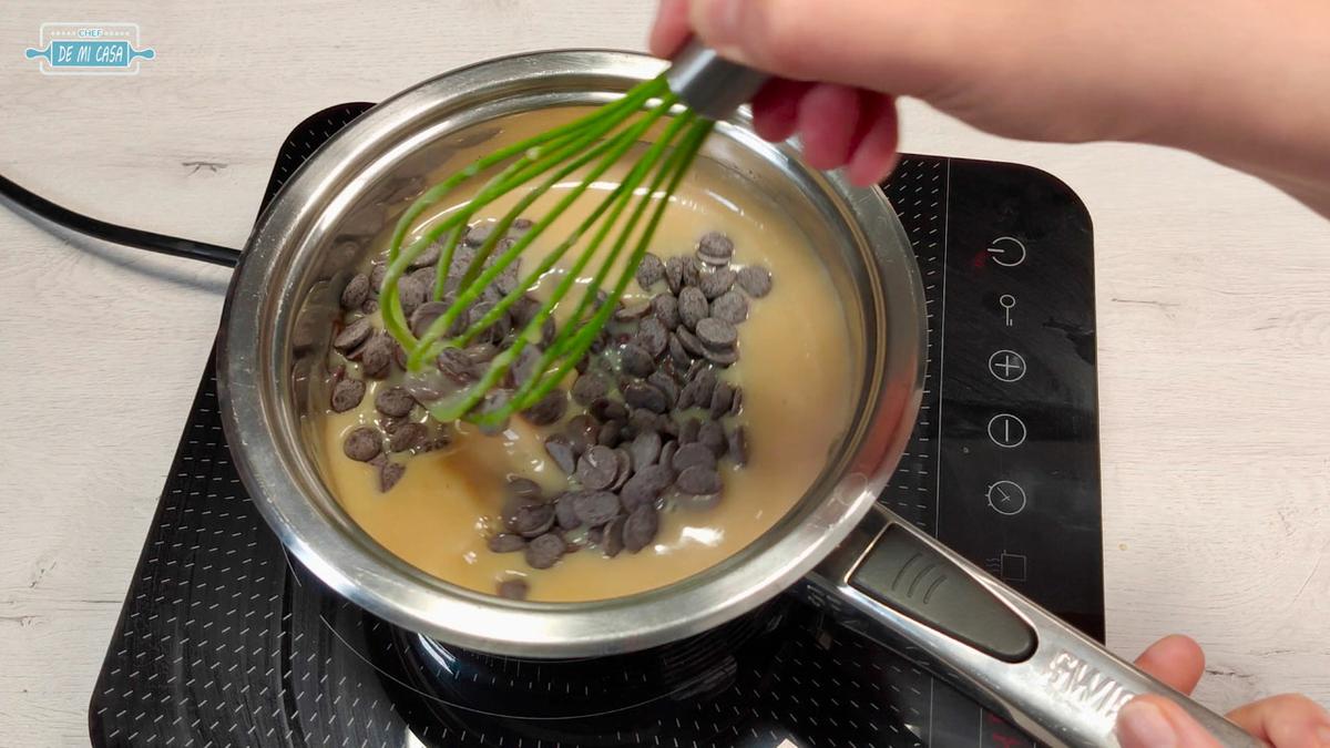 Bajamos el fuego al mínimo e incorporamos el chocolate y continuamos dando vueltas con las varillas hasta que se haya derretido por completo todo el chocolate. (este paso es muy importante que lo hagáis siempre a fuego mínimo ya que de lo contrario se os podría quemar el chocolate)